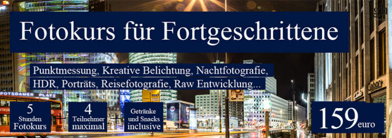 Im Fotokurs, „Fotografie für Fortgeschrittene in Berlin“ werden wir die Basis der Bedienung einer Spiegelreflexkamera oder einer Fotokamera mit manueller Bedienung schnell überblicken. Dann wird vertiefend gelernt: Manuelle Belichtung mit Punktmessung, Kreative Belichtung, Tiefenschärfe mit verschiedene Objektiven, Besondere Projekte wie Nachtfotografie, HDR, Porträts, Reisefotografie, Architektur und Natur. Wir werden lernen mit dem Computer zu arbeiten: Raw Entwicklung. Wir beschäftigen uns auch mit Bildgestaltung und lernen „fotografisches Sehen“ durch die Analyse der Arbeit von bekannten Fotografen.